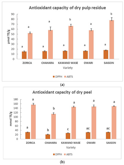 Antioxidant capacity in (a) dry pulp residue and (b) dry peel, as determined by two methods (DPPH and ABTS), in different varieties of mandarins from Neretva valley (Croatia). Results are expressed per g of dry weight mandarin pulp/peel. The same letters above the same-colored bars are not significantly different according to the post hoc t-test with Bonferroni adjustment (p < 0.05).