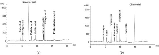 HPLC chromatograms of Albizia lebbeck acetone stem bark extract: (a) phenolic components; (b) flavonoid components.