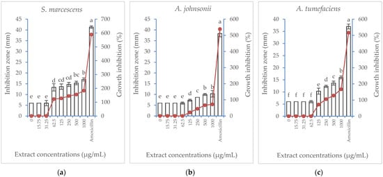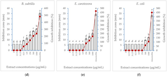 Effect of Albizia lebbeck acetone stem bark extract at different concentrations compared with amoxicillin at 62.5 µg/mL on the inhibition zone (vertical bars on primary axis) and growth inhibition percentage (line on secondary axis) of six bacterial strains: (a) Serratia marcescens, (b) Acinetobacter johnsonii, (c) Agrobacterium tumefaciens, (d) Bacillus subtilis, (e) Erwinia carotovora, (f) Escherichia coli. The vertical bars indicate the SD values (n = 4). Different lowercase letters indicate significant differences between various treatments according to the LSD test at p = 0.05.