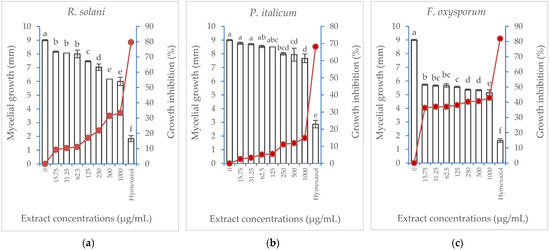 Effect of Albizia lebbeck acetone stem bark extract at different concentrations compared with hymexazol at 1000 µg/mL on the mycelial growth (vertical bars on primary axis) and growth inhibition percentage (line on secondary axis) of three fungal species: (a) Rhizoctonia solani, (b) Penicillium italicum, (c) Fusarium oxysporum. The vertical bars indicate the SD values (n = 4). Different lowercase letters indicate significant differences between various treatments according to the LSD test at p = 0.05.