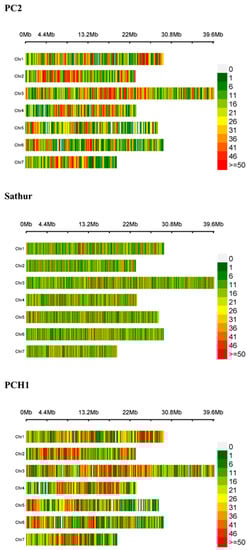 Using the reference genome and the GBS dataset, a total of 40,143, 181,008 and 43,612 SNPs were detected in the PC2, Sathur and PCH1, respectively (Figure 1 and Table 4). In order to increase the possibility of detecting unique candidate SNPs that were linked to gynoecy-specific genes, SNPs were only gauged from the exonic regions. In addition, SNPs in the exonic region were further categorized into eight groups, as presented in Table 4.