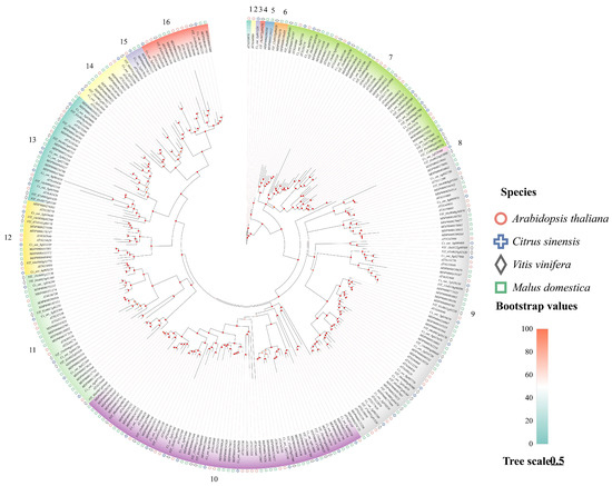 Evolutionary tree of the bZIP transcription factor family in Malus domestica, V. vinifera, C. sinensis, and A. thaliana. The evolutionary tree is based on 291 amino acid sequences encoded by M. domestica, V. vinifera, C. sinensis, and A. thaliana (see Supplementary Table S3 for details). bZIP genes and was constructed by IQ-TREE, a maximum likelihood tree-building software, after selecting the optimal tree-building model. The solid dots on each branch node indicate 1000 replicate bootstrap values. Red dots indicate bootstrap values of >90% in 1000 replicates, where the lighter the color of the dots, the lower the bootstrap values. The shapes on the outermost circle of the evolutionary tree represents the four different species, and the numbers 1 to 16 represent the 16 subgroups in this phylogenetic tree.