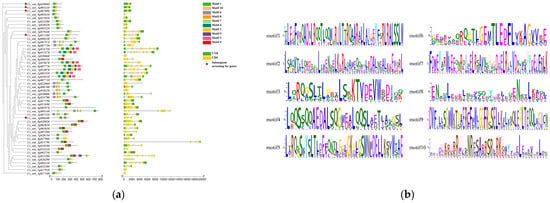Proteins with the same or similar conserved motifs in plants perform the same functions [31]. In this study, the conserved motifs of the sweet orange bZIP gene were searched using the online tool MEME [32] (http://meme-suite.org/, accessed on 26 July 2022), with the maximum number of motifs searched set to 10, with other parameters set to the defaults. Finally, on the basis of the annotated files of the sweet orange genome and the conserved motif search results, the Gene Structure View tool in TBtools (version 1.0987) [33] was used to visualize and embellish the conserved motifs and gene structure of sweet orange bZIP.