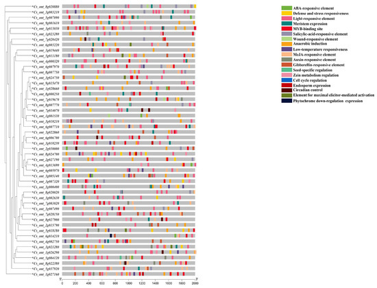 The paralogs with different cis-acting elements tend to have different expression patterns [34]. Cis-acting elements include promoters, enhancers, regulatory sequences, and inducible elements that regulate gene expression. A cis-acting element’s sequence does not encode any protein but merely provides a site of action to interact with the trans-acting element. In this study, after the genome annotation file of sweet orange had been obtained, the GXF Sequences Extract tool in TBtools [33] software was used to extract the 2000 bp gene sequence upstream of each sweet orange bZIP gene and upload it to the online promoter prediction tool PlantCARE [35] (http://bioinformatics.psb.ugent.be/webtools/plantcare/html/, accessed on 27 July 2022) for predicting the promoter cis-acting elements. Finally, the results were collated, visualized, and embellished using the Gene Structure View tool in TBtools software.
