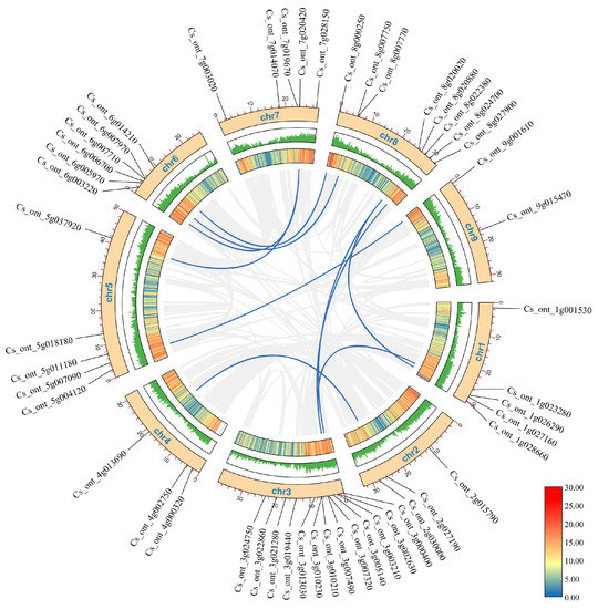 Colinearity refers to the large-scale homologous gene pairs in order of chromosomes [36]. The genome and annotation files of sweet orange and Arabidopsis were first obtained, then the bZIP genes of sweet orange and Arabidopsis were compared and analyzed by the One Step MCScanX tool in TBtools [33] software. Finally, the data were uploaded to the online tool ChiPlot (https://www.chiplot.online/, accessed on 30 July 2022) to plot and map the collinearity and chromosome distribution of the sweet orange bZIP gene family.