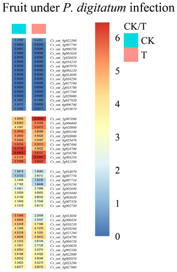Gene expression profile of the bZIP gene family in sweet orange fruit infected by Penicillium digitatum. T is the treatment group, and CK is the control group. The 50 sweet orange bZIP genes were classified into four categories with log2(FPKM + 1) expression values, with blue representing low gene expression and red indicating high gene expression.