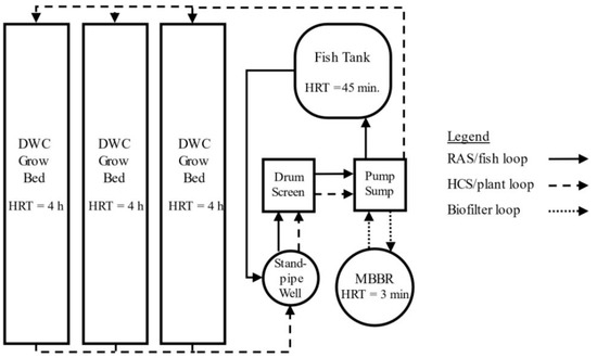 - Tetreault, J.; Fogle, R.; Fogarty, S.; Guerdat, T. Coupled aquaponics: Optimizing hydraulic retention times using a parallel unit process water treatment approach. Front. Hortic 2023, 2, 1140998. [Google Scholar] [CrossRef]