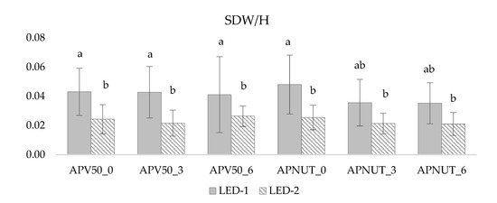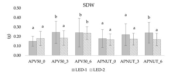 Shoot dry weight (SDW) of lettuce plants exposed to LED-1 and LED-2 lighting conditions. Statistically significant (p < 0.05) differences in the values are marked with different letters.
