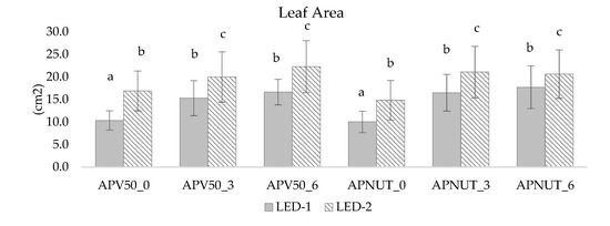 The analysis of the leaf area provided interesting results in terms of productivity: On average, the plants under LED-2 conditions developed wider leaves than those grown under LED-1 (p-value < 0.05). Furthermore, the addition of 3 or 6 C-PIM granules was correlated with a greater leaf area, as compared to the control plants, under each studied condition (Figure 4). An example is shown in Figure 5, where the leaves of two control plants exposed to different lighting conditions were compared. In detail, the mean of the leaf area obtained under LED-1 was 15.9 cm2 and 17.1 cm2 for the APV50 and APNUT samples, respectively, while the mean area obtained in the control samples was 10.3 cm2 and 10.0 cm2, respectively. The values increased with LED-2 exposure: The mean results were 21.1 cm2 and 20.8 cm2 for APV50 and APNUT, respectively, while the controls were 16.8 cm2 and 14.8 cm2, respectively.