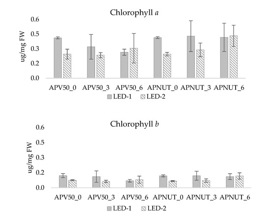 The application of six APV50 aggregates was consistently correlated with increases in shoot dry weight, under both LED schemes. The results were not the same with APNUT, with no significant weight improvements in the samples exposed to LED-2. The main biomass production by lettuce was achieved when exposed to LED-1. These results were consistent with data on the soil chemical content. Two of the main nutrients of the substrate (K and NO3) drastically decreased in the substrate of the samples exposed to LED-1, as compared to those exposed to LED-2. These findings suggested an improvement in the use of nutrients by plants when exposed to LED-1, which achieved the highest dry biomass production with a corresponding adsorption of nutrients from the soil. LED-2 exposure obtained the best performance, as compared to LED-1, in terms of plant height and leaf area, which were positively correlated with both C-PIMs. Therefore, the higher values obtained in substrates with APV50 aggregates that were exposed LED-1 indicated that this lighting scheme enhanced the biomass growth, while LED-2 promoted plant height. The differences are shown in Figure 2 and Figure 5, in which the APV50 control plants grown under LED-1 and LED-2 are compared.