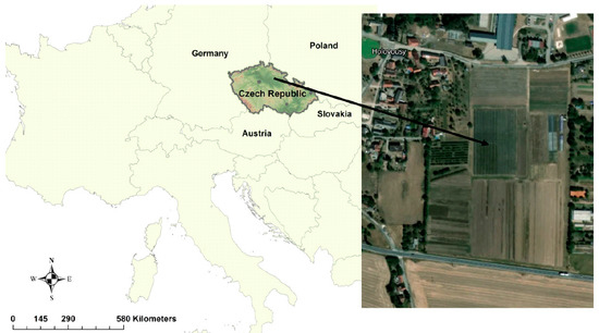 The three-year experiment (2019–2021) was performed at the Research and Breeding Institute of Pomology Holovousy (50.3733847′ N, 15.5798914′ E), in East Bohemia of the Czech Republic (Figure 1). The orchard is situated 302 m above sea level on Haplic Luvisol soil, and the slope is 2.09°.