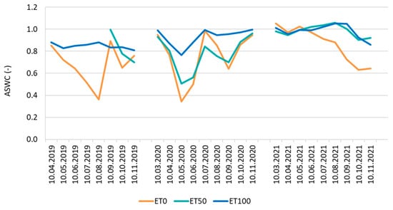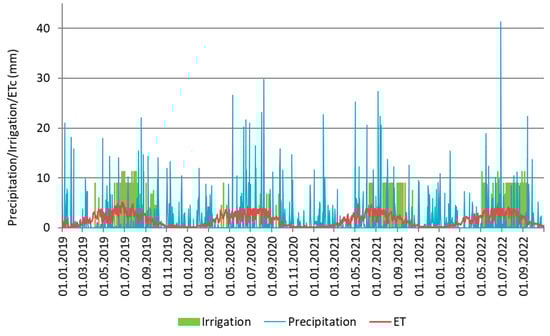 Daily precipitation sums, evapotranspiration (ET), and irrigation doses in experimental years (figure above). Average relative values of available soil water content (ASWC) (figure below).