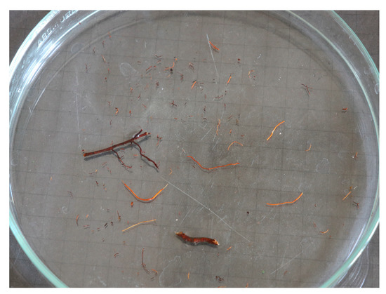 The roots were separated with water on a set of sieves, the samples were cleaned in the laboratory, and the length of the roots was determined by the method of Tennant [33]. The method is based on the number of intercrossings of roots with horizontal and vertical lines of a square grid. When measuring the length (intercrossings), new young vital roots, which accounted for averages of 37% (2019), 20% (2020), and 23% (2021) of the total root length, were distinguished. These vital roots, with a smooth undisturbed surface, were identified by color (light brown) from the older black and dark brown colored roots (Figure 4). The root density of all roots (RDt) and the root density of young vital roots (RDv) in cm·cm−3 were calculated for layers 0–20 cm, 20–40 cm, 40–60 cm, and 60–80 cm. The total root length (TRLt, TRLv) to a depth of 80 cm was calculated in km·m−2. The TRL (km·m2) was calculated by summing the root length from the RD (in cm·cm−3) in the respective layers to an 80 cm depth and converting the measurement from square cm to m2.