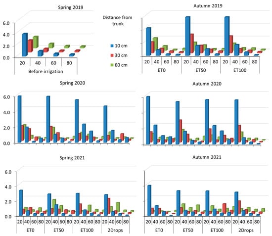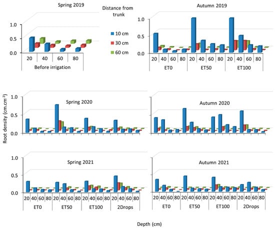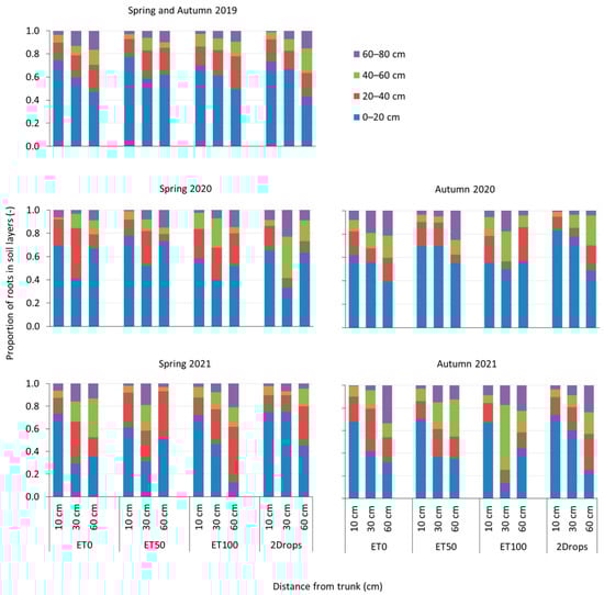 Proportion of the root density (RDt) in the soil layers (0–20 cm, 20–40 cm, 40–60 cm, and 60–80 cm) in increasing distance from the trunk (10 cm, 30 cm, and 60 cm), in the spring and autumn sampling terms. ET0, ET50, ET100, and 2Drops refer to irrigation water rate variants (see Figure 5).