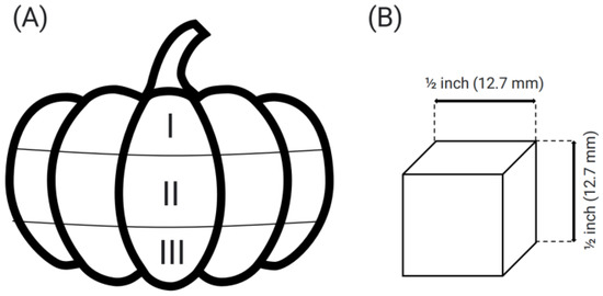 The texture profile of the flesh was determined by using a double compression test following Marian [39] with minor changes. The flesh collected for analysis was only from the midsection (labeled II) of the pumpkin at a distance of 4 mm from the skin for uniformity, as shown in Figure 2. The other sections of the calabaza fruit (labeled I and III) were not utilized for this analysis. Due to the curvature of the calabaza, the axis of the square samples was perpendicular to the surface of the skin.