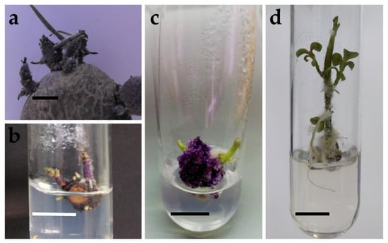 The in vitro initiation and subculture of PFPs; (a) sprouts of PFP tuber; (b) explant initiation; (c) hypertrophic process, purple callus generation, and shoot development on explant; (d) in vitro PFP complete plantlet development that is suitable for multiplication. Scale bar represents 1 cm.