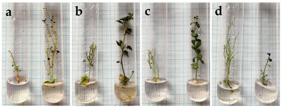 Subculture of micro-cuttings for each studied PFP variety after three weeks from the initiation moment; MS medium—left side; MS + Gly medium—right side; (a) Blue Danube; (b) Salad Blue; (c) Violet Negretin; (d) Violet Queen.