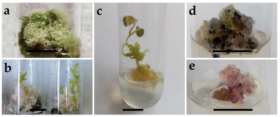 Callus aspect of SB variety in the culture media tests: (a) C1; (b) C2; (c) C3; (d) C4, (e) C5. Scale bar represents 1 cm.