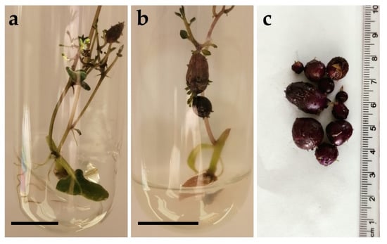 Microtubers obtained from the SB variety on the culture medium MT2; (a,b) in vitro microtubers of SB variety; (c) microtubers from SB variety generated using MT2 culture medium. Scale bar represents 1 cm.