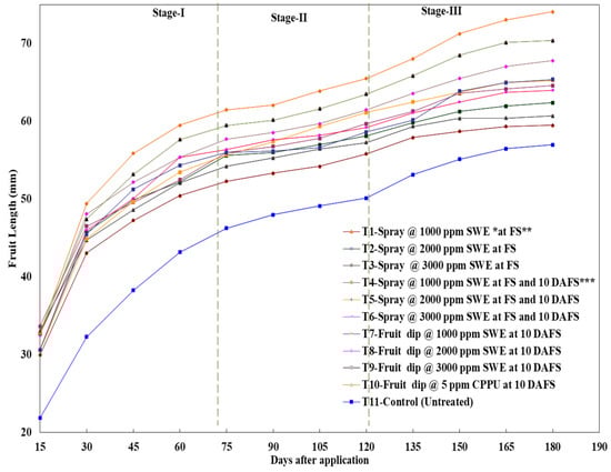 Our study provides more robust results than those previously carried out since our research predicted that the seaweed extract exhibited positive responses in the growth stages of the kiwifruit by extending the fruit shelf life. Rana and Rana [3] also reported that kiwifruit exhibited a double sigmoid growth curve, characterized by rapid growth for 75 days (stage I), a period of slow growth for 15 days (stage II), and a period of enhanced growth for 90 days (stage III). An investigation by Hayat [19] on kiwifruit cvs. Allison and Hayward revealed that the kiwifruit exhibited a characteristic double sigmoidal growth curve and observed a significant increase in fruit size till 75 days after full bloom (stage-I), reduced fruit size growth till 120 days after full bloom (stage II), and linear increase in size till 195 days after full bloom (stage-III). In the present investigation, it was revealed that the applications of seaweed extract have increased the fruit length as compared to untreated fruits but the increase in fruit length was lesser than CPPU-treated fruits. Rana et al. [8] reported that the seaweed extract contains cytokinins and gibberellins which are responsible for the regulation of cell division and cell elongation in plants. The enhancement of cytokinin in the CPPU and SWE-treated fruits might have increased the number of cells by increasing cell division. The seaweed extract has also been reported to increase the fruit length of grapes [16,20].