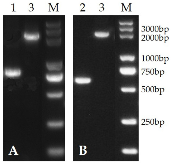 PCR confirmation of PafQ and PafR deletion mutants. (A), PafQ; (B), PafR; M, marker 5000; 1, P. glycinae mutant MT13385; 2, P. glycinae mutant MT24120; 3, P. glycinae MS82 (wild-type strain).