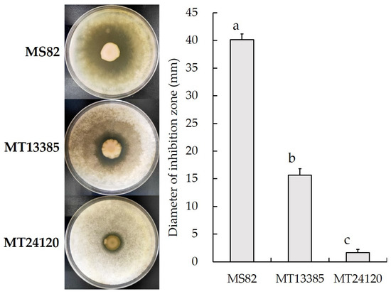 Inhibition of PafQ and PafR deletion mutants against T. virens. Different letters indicate values are significantly different (p < 0.05). MS82, P. glycinae wild-type strain; MT13385, PafQ deletion mutant; MT24120, PafR deletion mutant.