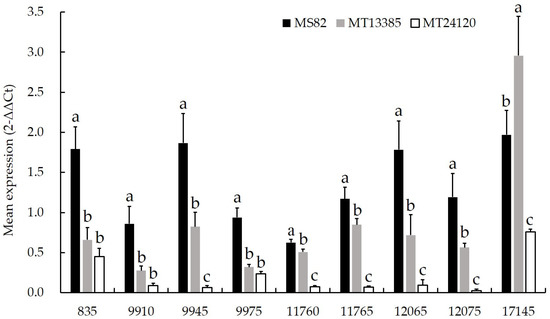 qRT-PCR analysis of nine genes in PafQ and PafR deletion mutants. The nine genes are shown as identification numbers shown in the genome GenBank accession number CP028826.1. Different letters indicate values are significantly different (p < 0.05). MS82, P. glycinae the wild-type strain; MT13385, PafQ deletion mutant; MT24120, PafR deletion mutant.