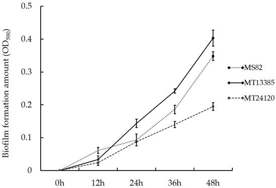 Effects of deletion of genes PafQ and PafR on bacterial biofilm formation were analyzed and shown in Figure 4. At 12 h, the amounts of biofilm formed by both mutants were lower compared with that of strain MS82. However, at 24 h, the amount of biofilm formed by MT13385 was significantly higher than those of strains MT24120 and MS82. After 36 h, the biofilm formation amount of strain MS82 was significantly lower compared with that of strain MT13385 and significantly higher than that of strain MT24120. These data suggest deletions of genes PafQ and PafR have opposing effects on bacterial biofilm formation.