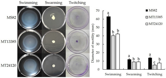 The motility assay showed slightly different results among the three types of motility (Figure 5). The diameters of the two deletion mutants (strains MT13385 and MT24120) for all three motility assays were significantly lower than those of the wild-type strain MS82. In the swimming and swarming motility assays, the diameters between the two mutants was not different significant; however, in the twitching motility assay, the diameter of strain MT24120 was significantly higher than that of strain MT13385. These results indicated that both PafQ and PafR had positive effects on motility ability, but the extent of the effects was different.