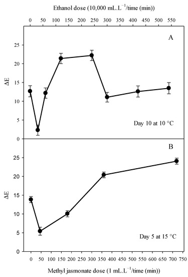 - Fan, X.; Mattheis, J.P. Methyl jasmonate promotes apple fruit degreening independently of ethylene action. HortScience 1999, 34, 310–312. [Google Scholar] [CrossRef]