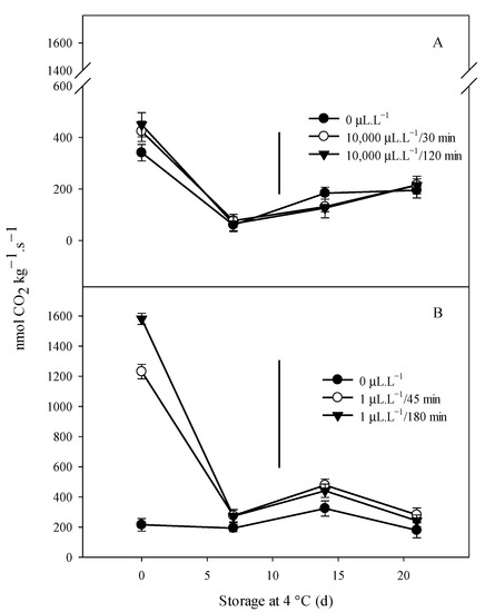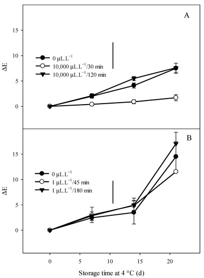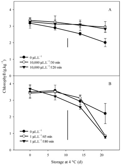 - Fukasawa, A.; Suzuki, Y.; Terai, H.; Yamauchi, N. Effects of postharvest ethanol vapor treatment on activities and gene expression of chlorophyll catabolic enzymes in broccoli florets. Postharvest Biol. Technol. 2010, 55, 97–102. [Google Scholar] [CrossRef]