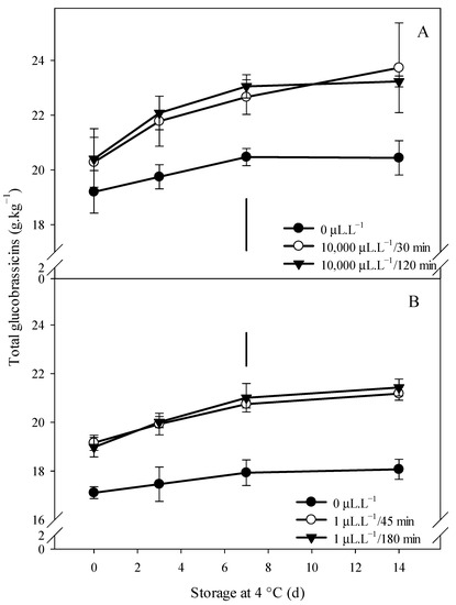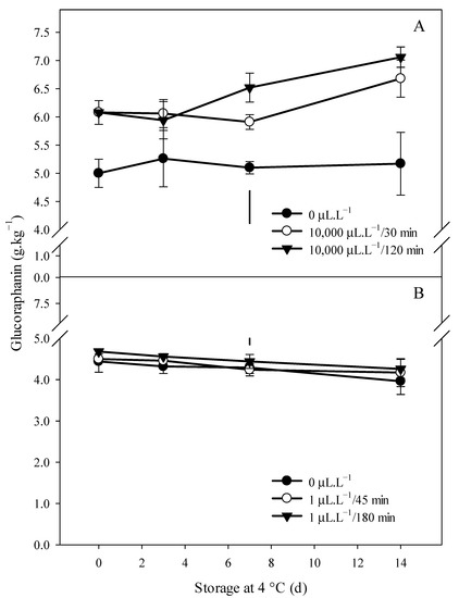 - Rangkadilok, N.; Tomkins, B.; Nicolas, M.E.; Premier, R.R.; Bennett, R.N.; Eagling, D.R.; Taylor, P.W.J. The effect of post-harvest and packaging treatments on glucoraphanin concentration in broccoli (Brassica oleracea var. Italica). J. Agric. Food Chem. 2002, 50, 7386–7391. [Google Scholar] [CrossRef] [PubMed]