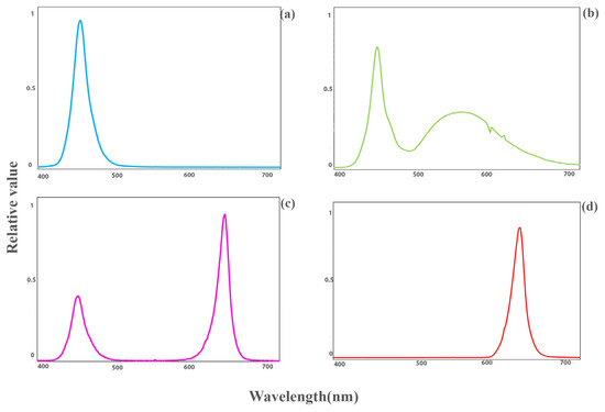 Light spectra of blue ((a); 400–500 nm), white ((b); 35% blue (400–500 nm), 48% intermediate (500–600 nm), and 16% red (600–700 nm)) as control, red and blue ((c); 32% blue (400–500 nm), and 68% red (600–700 nm)), and red ((d); 600–700 nm) light quality regimes under study.