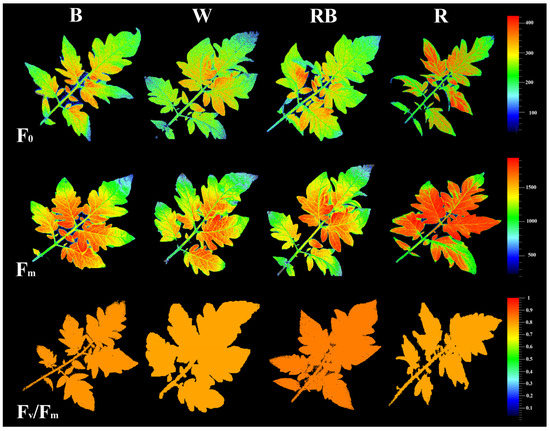 Representative images of fluorescence parameters including F0, Fm, and Fv/Fm exhibited by leaves sampled from grafted tomato seedlings exposed to different light qualities (including white (W; 35% B, 49% intermediate spectra, 16% R) light as control, blue (B), red (R), and a combination of red (68%) and blue (RB), (see the correspondence spectrum in Figure 1)), with 75 ± 5 µmol m−2 s−1 PPFD for 20 days.