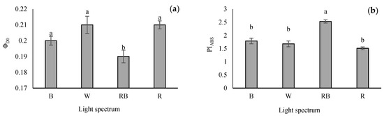 The quantum yield of energy dissipation (φD0; (a)), and performance index in light absorption basis (PIABS; (b)) from the fluorescence transient exhibited by leaves sampled from grafted tomato seedlings exposed to different light qualities (including white (W; 35% B, 49% intermediate spectra, 16% R) light as control, blue (B), red (R), and a combination of red (68%) and blue (RB), (see the correspondence spectrum in Figure 1)), with 75 ± 5 µmol m−2 s−1 PPFD for 20 days. Columns with the same letters are not significantly different at p ≤ 0.05, according to Duncan’s multiple range tests. Bars represent the mean value of three replications ± SEM.