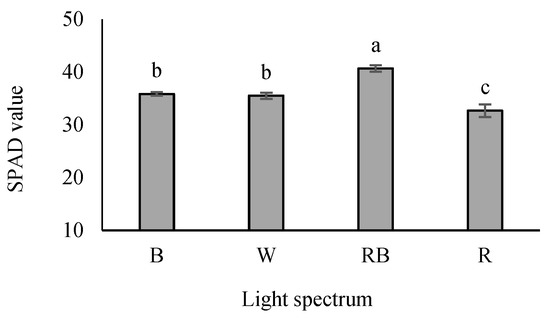 The SPAD value was the highest in RB-exposed seedlings, while its lowest value was detected under R-exposed seedlings. An intermediate SPAD value was also recognized in W- and B-exposed seedlings (Figure 6).