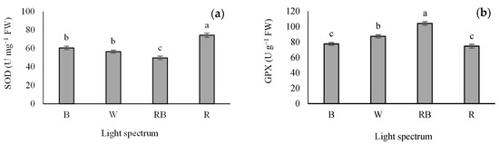 Superoxide dismutase (SOD; (a)) and guaiacol peroxidase (GPX; (b)) activity in grafted tomato seedlings exposed to different light qualities (including white (W; 35% B, 49% intermediate spectra, 16% R) light as control, blue (B), red (R), and a combination of red (68%) and blue (RB), (see the correspondence spectrum in Figure 1)), with 75 ± 5 µmol m−2 s−1 PPFD for 20 days. Columns with the same letters are not significantly different at p ≤ 0.05, according to Duncan’s multiple range tests. Bars represent the mean value of three replications ± SEM.