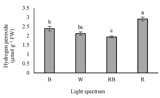 According to our results, H2O2 accumulation was the highest in seedlings exposed to R light, while exposure to W and RB lights reduced H2O2 levels in the leaves (Figure 8).