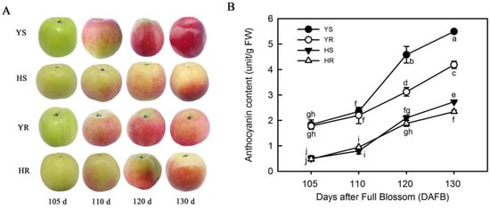 - Shi, C.; Liu, L.; Wei, Z.; Liu, J.; Li, M.; Yan, Z.; Gao, D. Anthocyanin accumulation and molecular analysis of correlated genes by metabolomics and transcriptomics in sister line apple cultivars. Life 2022, 12, 1246. [Google Scholar] [CrossRef]