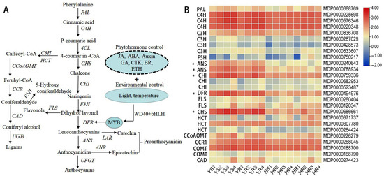 - Hu, Y.; Cheng, H.; Zhang, Y.; Zhang, J.; Niu, S.; Wang, X.; Li, W.; Zhang, J.; Yao, Y. The MdMYB16/MdMYB1-miR7125-MdCCR module regulates the homeostasis between anthocyanin and lignin biosynthesis during light induction in apple. New Phytol. 2021, 231, 1105–1122. [Google Scholar] [CrossRef]