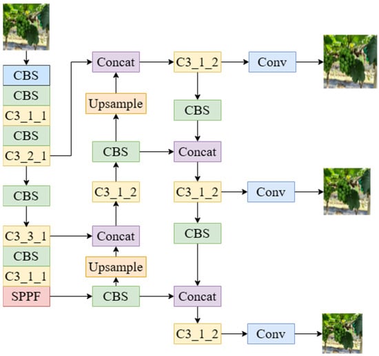 This study proposes to use the weighted Bidirectional Feature Pyramid Network (BiFPN) instead of PANet. To fully express different input features, BiFPN uses learnable weights to fuse input features of different resolutions [46]. In addition, the top-down and bottom-up fusion strategies in PANet were used for reference and the feature fusion was repeated many times. BiFPN added skip links in the same layer and considered that when a node had only one input edge the contribution to feature fusion was small. BiFPN deleted nodes with only one input edge, which did not bring too much computational cost, and thus more features were fused. The schematic diagram of the structure is shown in Figure 8B.