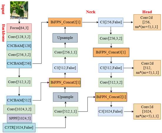 To quickly and accurately calculate the image position of grapes, it was necessary to consider the real time and accuracy of the target-detection algorithm, so as to meet the needs of efficient picking operations by picking robots. To detect grapes in a wild orchard environment more quickly and accurately, realize efficient automatic grape picking, and solve the problems of labor shortage and high labor cost, this study proposes the YOLOv5-GAP grape-detection algorithm based on the YOLOv5s-6.0 algorithm. As YOLOv5s is the network model with the smallest depth and least speed consumption in the YOLOv5 series, this study improved the grape-detection network model on the basis of YOLOv5s. The YOLOv5-GAP algorithm improved the Backbone network structure of the original algorithm, changed the Conv layer of the first layer to the Focus layer, and divided the image input into the network into several parts, which was conducive to extracting more feature information during downsampling. A convolution attention mechanism and TransformerBlock module were added, the amount of calculation was reduced to better extract global information, a more efficient weighted Bidirectional Feature Pyramid Network was proposed to fuse features of different resolutions, and an adaptive activation function was used to replace SiLU. As a result, the system could learn and decide whether to activate neurons to realize the dynamic control of the nonlinear degree of each layer of the network, so as to further improve the accuracy of the grape-detection algorithm. After the series of improvement methods mentioned above, the network structure diagram of YOLOv5-GAP, a grape-detection algorithm based on YOLOv5, was finally proposed (Figure 3).