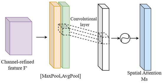The spatial attention module is shown in Figure 6 below. The feature map F’ output by the channel attention module was used as the input feature map of this module. First, average and max pooling were performed on the input features and then the pooled results were concatenated on the channel. Then, a convolutional layer was put through to reduce its dimensionality to one. Finally, the spatial attention map Ms was generated through the sigmoid function. The spatial attention mechanism was expressed as:
