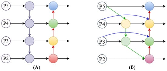 The Neck network was designed to better utilize the features extracted by the Backbone network. It reprocesses and makes reasonable use of the feature maps extracted at different stages. The Neck of the YOLOv5 algorithm adopts the path aggregation network (PANet) [44]; a schematic diagram of the structure is shown in Figure 8A. The characteristics of the PANet structure are that a top-down and bottom-up bidirectional fusion link is established at the P2 to P6 layers. Compared with the top-down fusion strategy proposed by FPN [45], PANet strengthens the underlying network Up-passing for more location information.