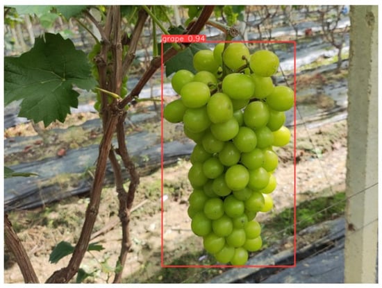 In this paper, the Intersection over Union (IOU) ratio between the prediction results and the real target label was used to determine whether the detected target was grapes. When the value of the IOU is greater than the set threshold, it was considered to have successfully detected grapes, and the calculation of the IOU can be expressed by Equation (11). The IOU was set to 0.55 during the experiment in this article.