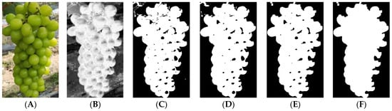 The open operation in mathematical morphology can smooth the contours of an image, break narrow connections, and eliminate burrs. The filtered binary image noise here was mainly composed of surrounding noise blocks and inner noise holes. For noise blocks, the morphological opening operation was used to eliminate part of the influence. The findContours function for internal noise holes was used to select the RETR_CCOMP mode, find the contour of the hole in the grape bunch, judge the size of each contour, and fill it when it was <60 pixels; the image segmentation process is shown in Figure 10. After image segmentation, some green leaves might be separated from the overall outline of the grape. However, the size of these green leaves was negligible.