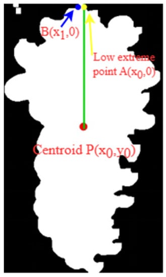 The centroid of the grape bunch obtained through the above calculation is shown in Figure 11. The P coordinate of the centroid was (x0, y0) and, when the fruit axis pointed vertically downward, it was usually above the centroid of the bunch. Here, A(x0,0) directly above the centroid P(x0, y0) was taken as the lower extreme point of the fruit stem, the position 10 pixels directly above the lower extreme point was the picking point, and the position coordinates of the picking point were (x0, −10). Notably, the lower extreme point of the actual fruit stem was B(x1,0), such that Equation (6) for the pixel error value of the lower extreme point was: