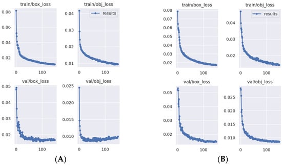 The divided training and validation sets were input into the YOLOv5 and YOLOv5-GAP networks for training. After 150 batches of training, the obj loss and box loss function value curves during training were obtained (Figure 12).