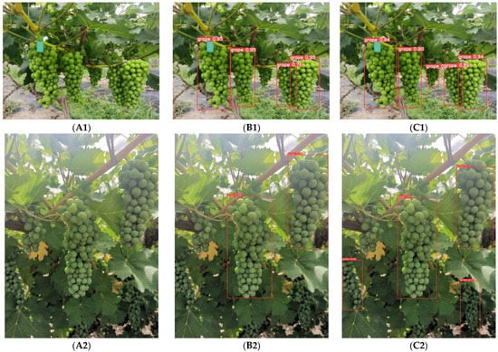 In this paper, the grape pictures of Zengcheng District, Guangzhou (Figure 13(A1)), and the grape pictures of Babao Baron Winery, Shihezi, Xinjiang (Figure 13(A2)), were tested, respectively, and compared with the original YOLOv5 network, to demonstrate the detection effect of the YOLOV5-GAP algorithm on grapes. The test results are shown in Figure 13.