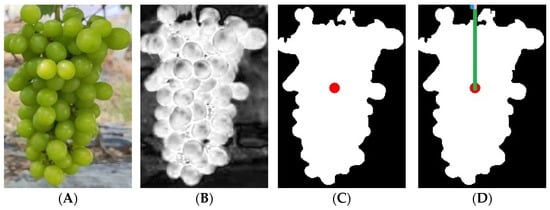 (4) The digital image processing algorithm and mathematical geometry were combined to segment the grape cluster string recognized by YOLOv5-GAP, and the picking point was determined after finding the centroid coordinates.